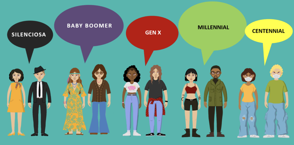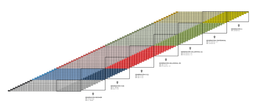 Cada generación de turno la denominamos con los mismos nombres que utiliza la mayoría de las fuentes, por ejemplo, “Babyboomer”, “GenX” o “Millennial”.