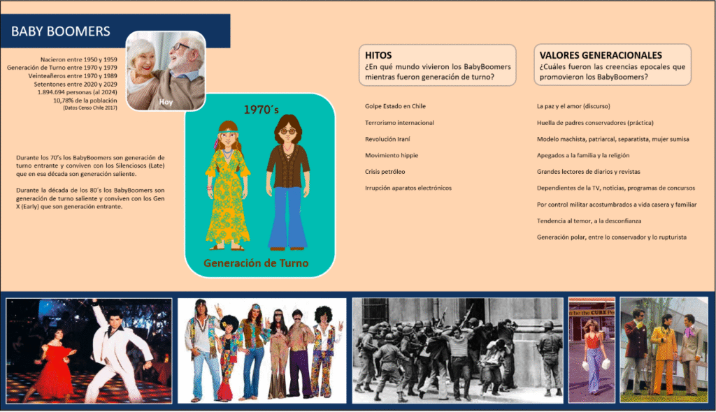 Los Babyboomers fueron generación de turno entre 1970 y 1979 (mientras tuvieron entre 20 y 29 años) A una generación la nombramos por los años en que fue generación de turno y no por el período de nacimiento.