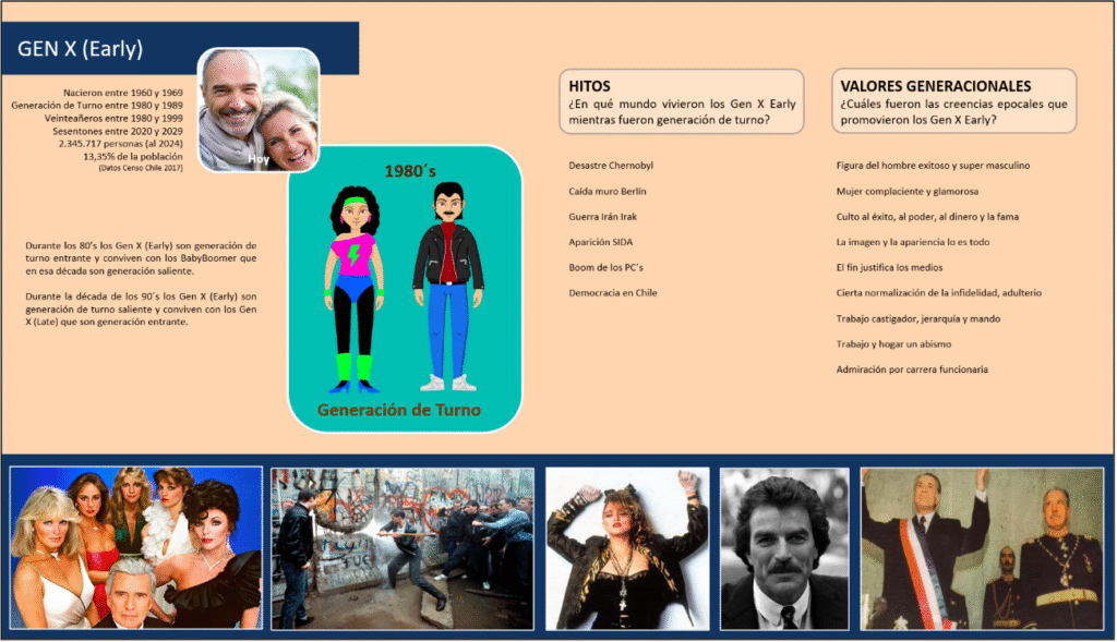 Distinguimos por un lado la fecha de nacimiento de cada generación, considerando períodos regulares de 10 años. Por ejemplo, los Babyboomers nacieron entre 1950 y 1959. Los GenX Tempranos entre 1960 y 1969 Y luego distinguimos períodos regulares también de 10 años para determinar cuándo fueron generación de turno.