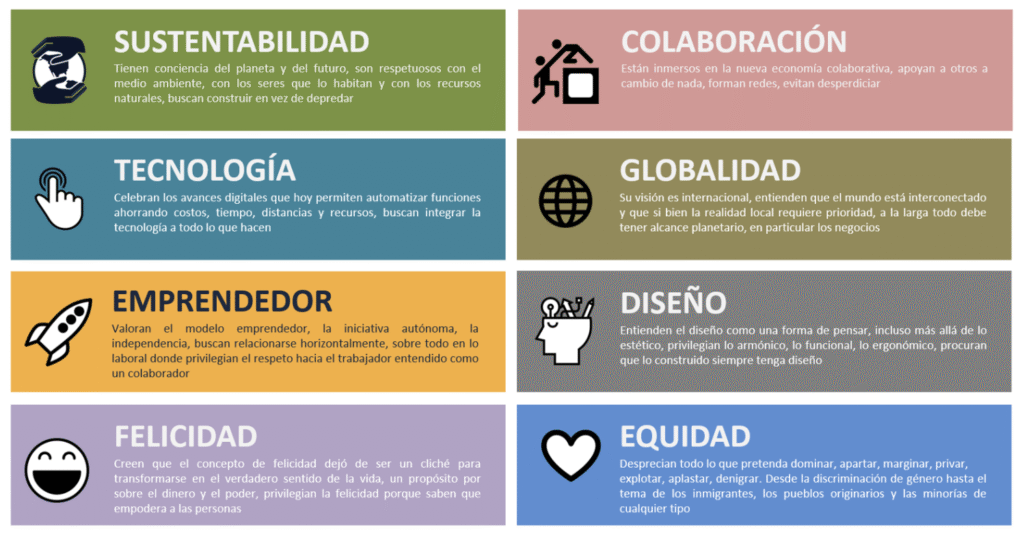 Revisemos en el cuadro 3 los valores Millennials, que aún son representativos de los años veintes, aunque a partir del 2025 empezarán a ser más gravitantes los valores Centennials.